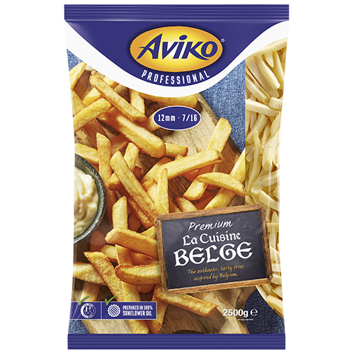 Aviko La Cuisine Belge Artisanale Friet 12 mm zijn diepvries frites die ogen als huisgemaakt. De frites zijn gemaakt van bintjes waardoor ze een pure, volle aardappelsmaak hebben.