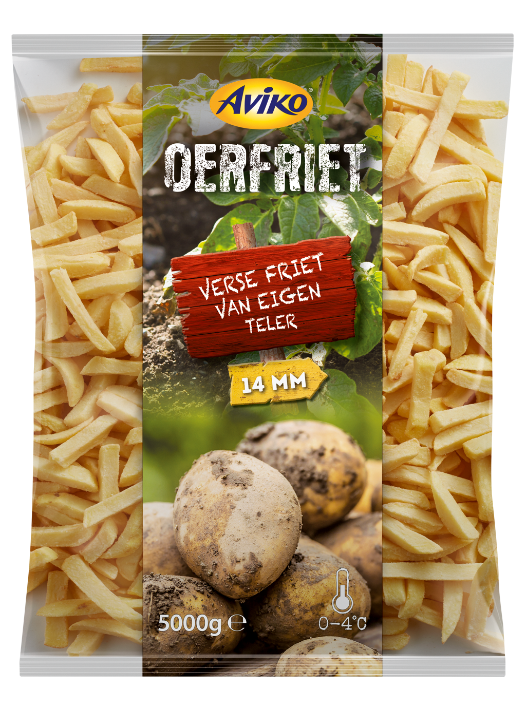 Aviko Oerfriet 14 mm zijn koelverse frites die ogen als huisgemaakt. De frites zijn gemaakt van de Hollandse agria-aardappel, hierdoor hebben ze een volle aardappelsmaak.