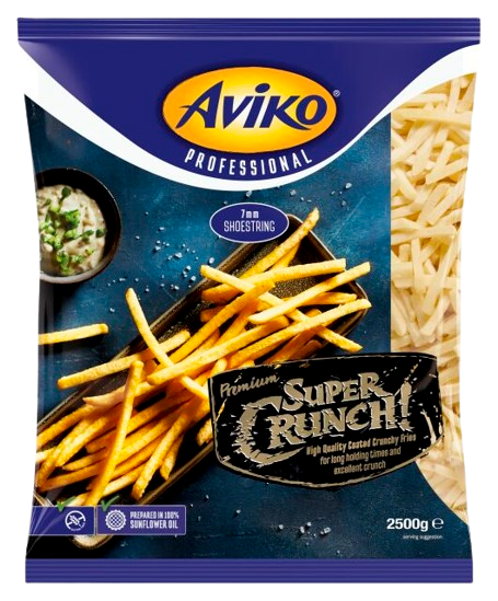 Aviko SuperCrunch frites hebben een speciale coating. Hierdoor zijn de frites extra krokant en blijven ze langer warm. Ideaal voor thuisbezorging.